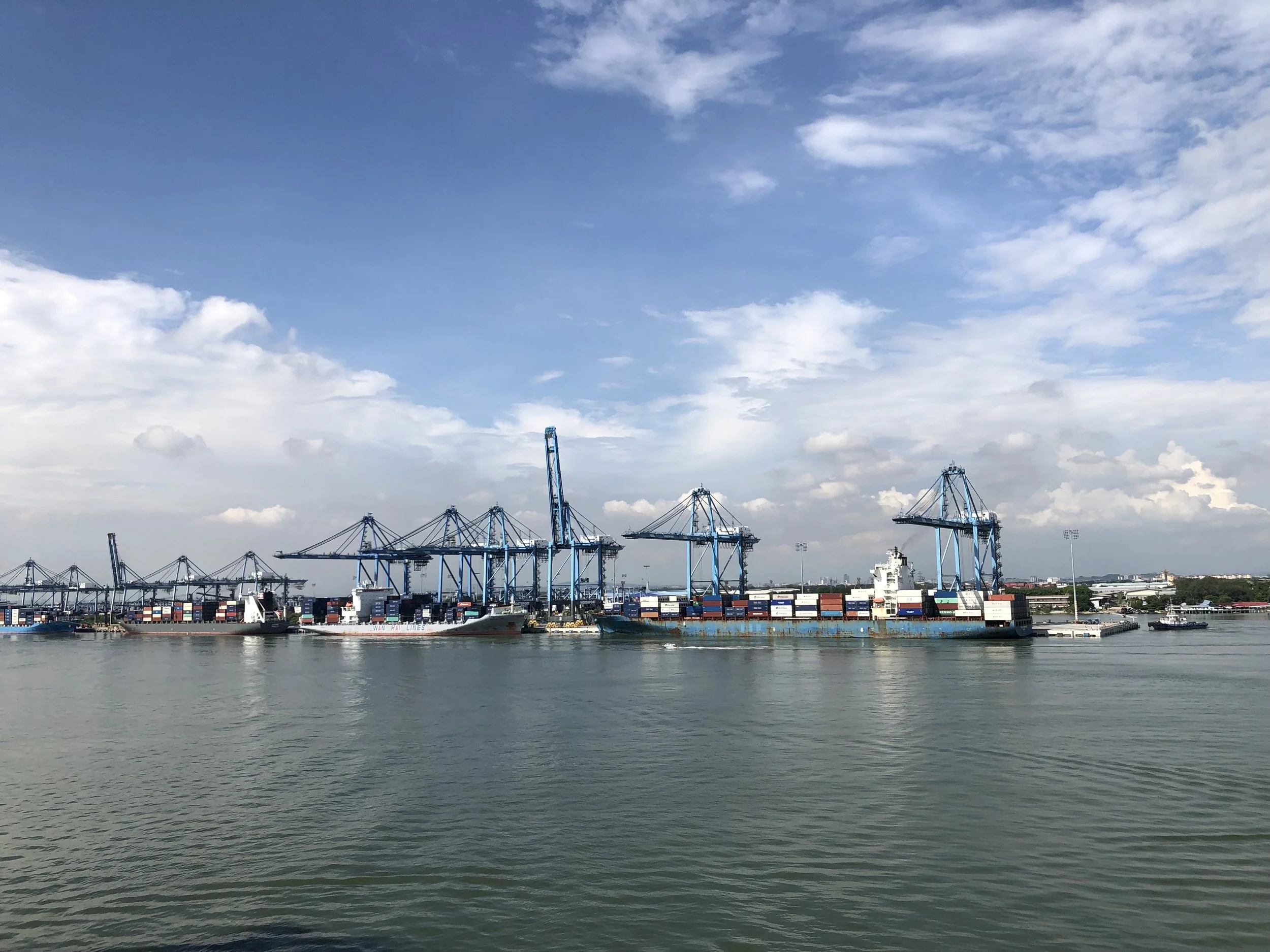 Container cranes at Port Klang, viewed from the Strait of Malacca